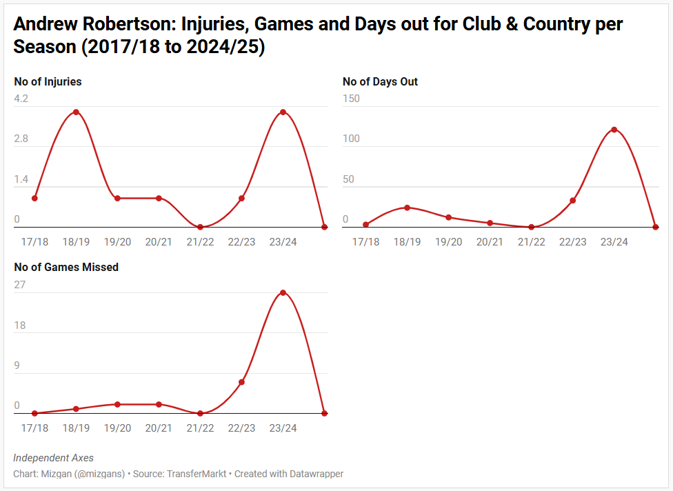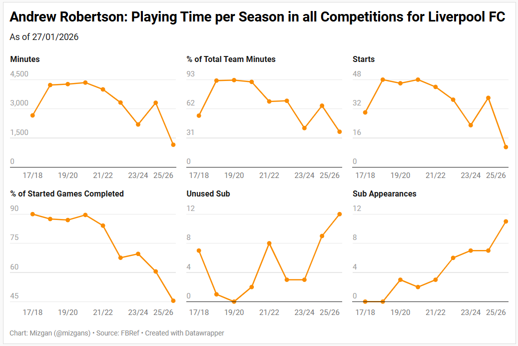 The 2023/24 campaign brought his first major physical setback at Liverpool, as a shoulder injury kept him out for close to three months, resulting in a drop in game time. In the 2024/25 season (the first season under Arne Slot), his number of starts increased, but there was a decline in the percentage of games he completed while starting.