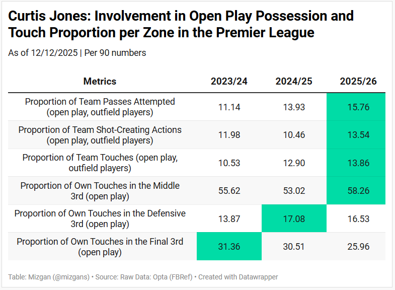 Jones has increased his open-play passes, shot-creating actions, and overall touch involvement by a fair margin this season. It shows that he is able to remain effective on the ball despite seeing much more of it than before. Very encouraging signs.