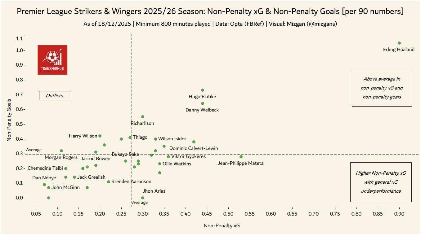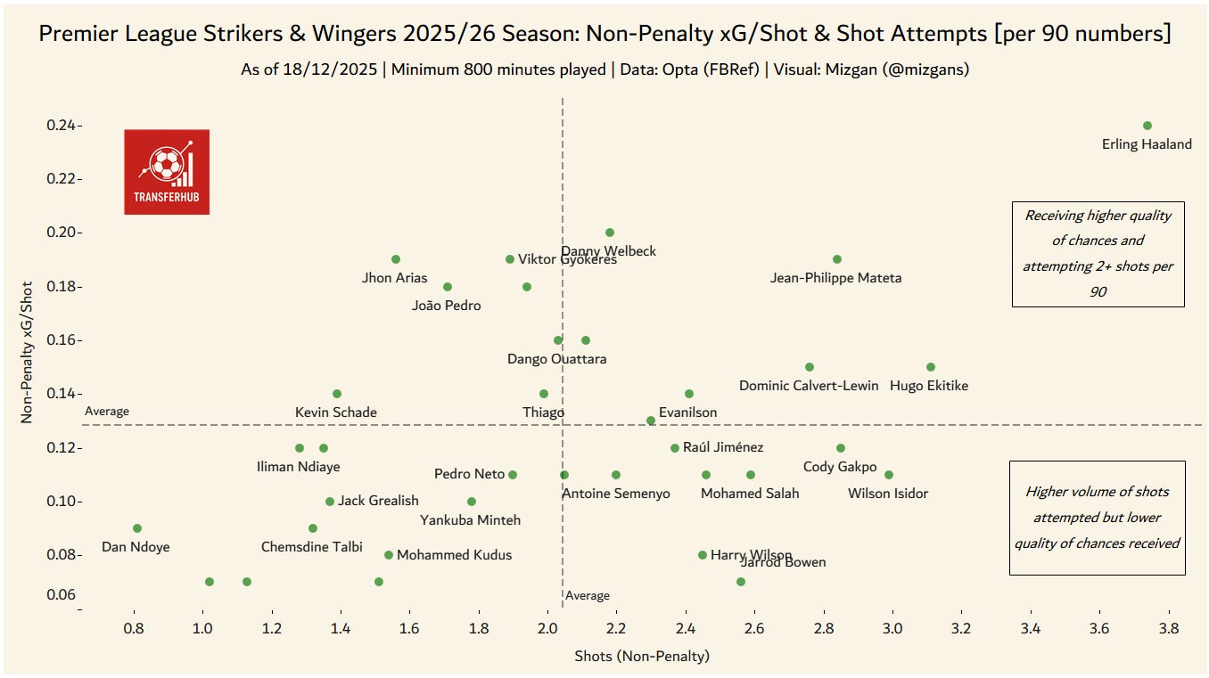 Ekitiké ranks second only to Haaland for non-penalty goals and third for non-penalty xG. Although the Frenchman has not played as many minutes as the likes of Haaland or Jean-Philippe Mateta, the data suggests that the more he stays on the pitch or starts matches for Liverpool, the more goals he is likely to score and the more often he will get on the end of chances of good quality.