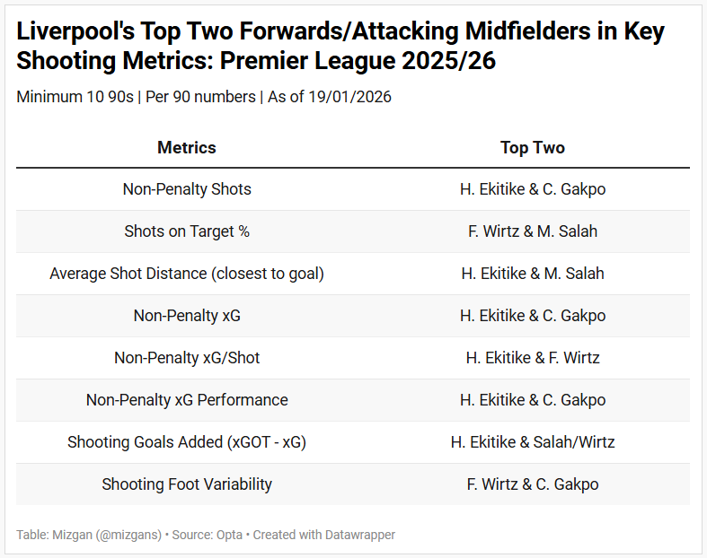 Gakpo appears in four of the metrics. While his goal contribution numbers are decent (eight, second only to Ekitiké among Liverpool players this season), the Dutchman’s overall performance and shooting quality have declined compared to last season.