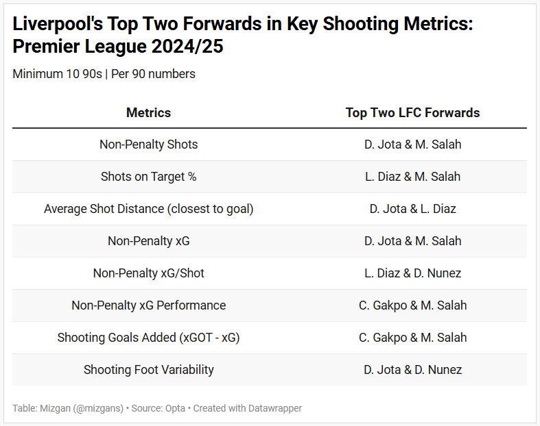 Before looking at the changes made last summer, let’s go through a couple of tables showing the top two Liverpool forwards for key attacking metrics, including shooting and possession, in the Premier League last season. This will help us identify who the most ‘reliable’ forwards were for Arne Slot at that time.