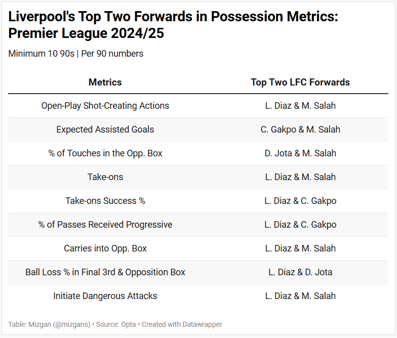 Out of the nine key possession metrics relating to chance-creation, take-ons, and other attacking actions, Díaz featured in seven of them as one of the top two Liverpool forwards. This highlights how important the Colombian was in open-play chance-creation, take-ons and success of them, carries into the box, initiating attacks, and retaining possession effectively in the final third and beyond.