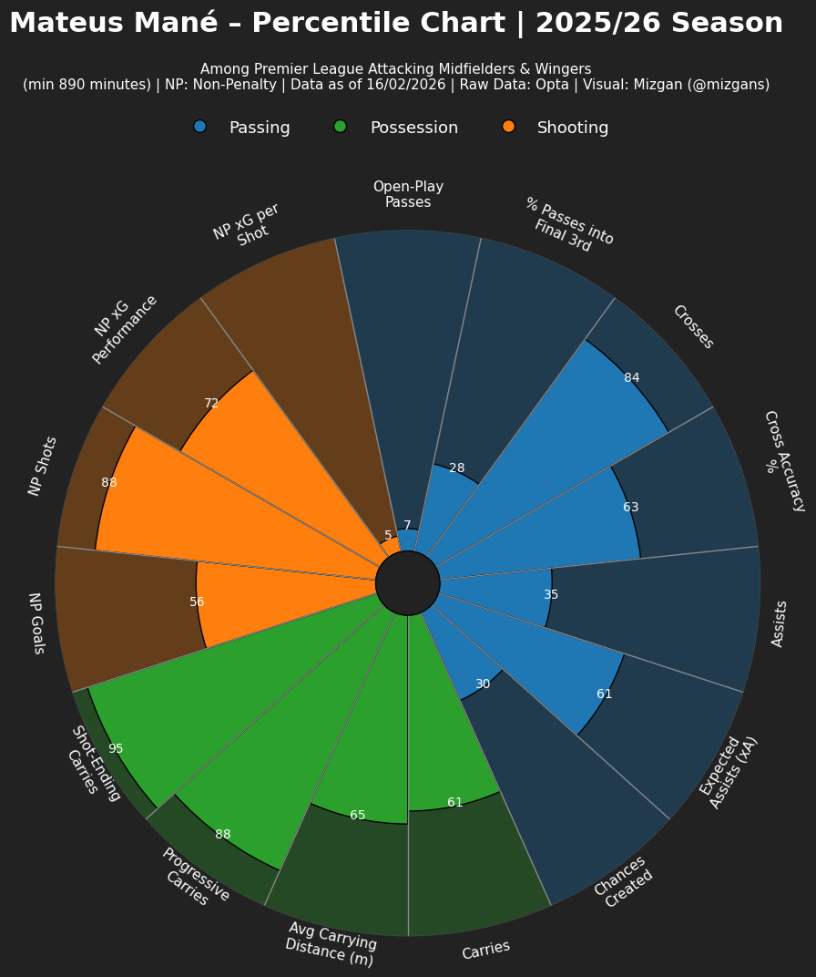 Mateus Mané: Percentile Numbers (2025/26 Season)