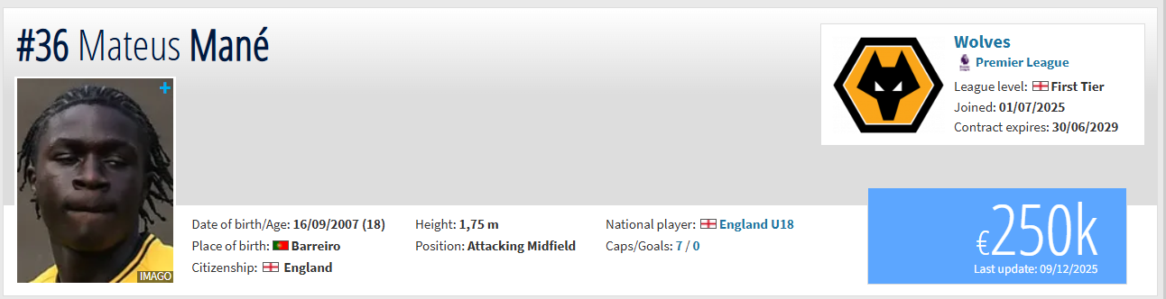 A bit of background on the player before we look at his numbers in detail to profile him: Mané was born in Portugal before moving to Greater Manchester to join the Rochdale youth academy in 2016 (eight years of age then). He stayed there for eight years before signing for the Wolverhampton Wanderers academy in March 2024, aged 16 at the time.