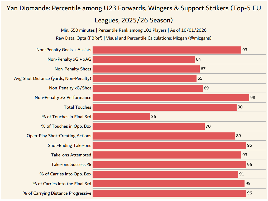 The previous paragraph shows that Diomandé is not just a finisher who may be overperforming his xG to some extent. He is an all-round winger who contributes to chance creation, completes a high volume of dribbles with a strong success rate, and carries the ball from deeper areas into dangerous positions, among other qualities.